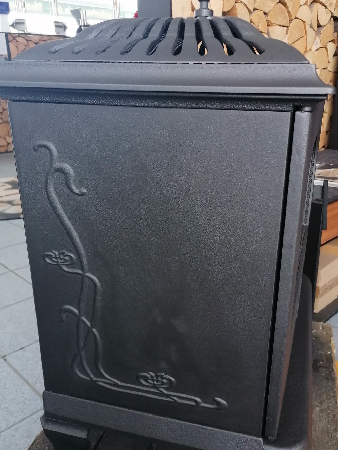 Das seitliche florale Dekor und seine historische Erscheinung wurde mit moderner, großer Scheibe und damit bester Sicht aufs Feuer kombiniert - das Beste aus alt und neu. Die Krone ist drehbar oder abnehmbar und darunter befindet sich eine Kochplatte.