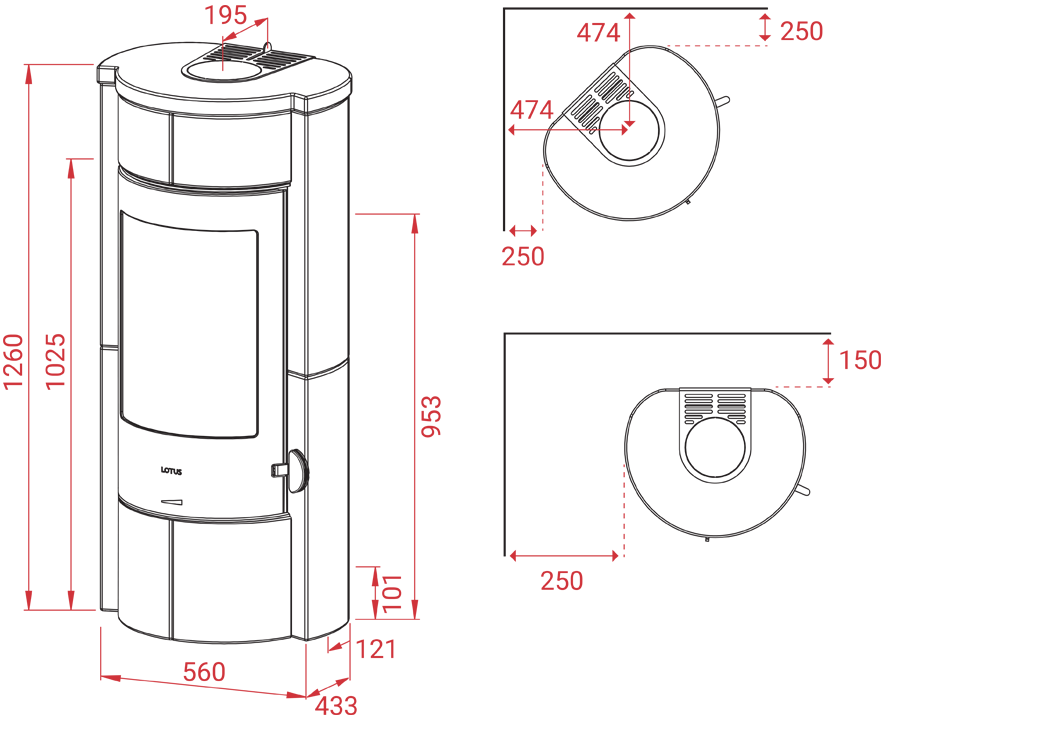 - Abstand zu brennbarer Seitenwand/Hinterwand: 250/150mm