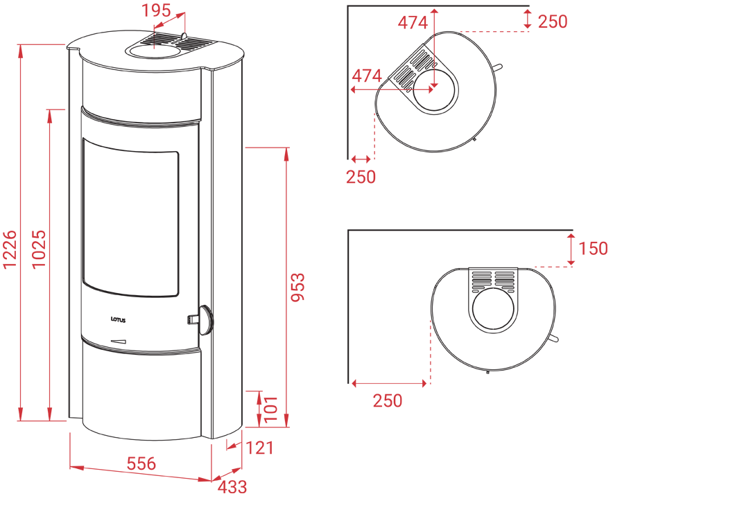 - Rauchrohranschluss: hinten/oben Ø 150mm